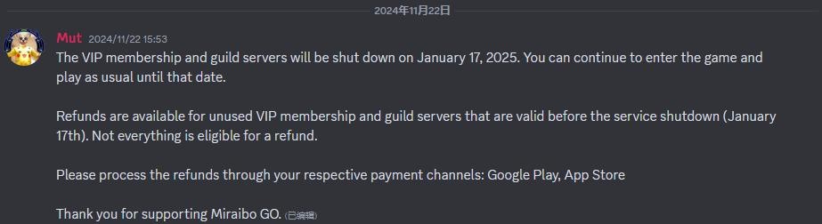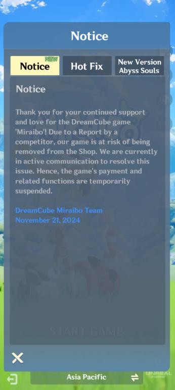 祖龙娱乐在海外上线的帕鲁like产品《Miraibo Go》发布公告,表示「因为一名竞争对手的报告,我们的游戏有被下架的风险」,目前游戏已经下架并已关闭充值渠道,预计将在2025年1月17日关闭服务器。