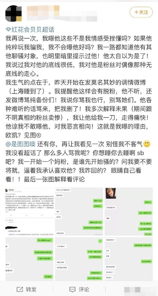 贝贝的粉丝,曝出了贝贝和自己以及和他人暧昧的记录。这位粉丝表示,自己知道贝贝在和自己暧昧的时候,同时也和他人聊着,但自己觉得并无不妥,直到后来贝贝突然开始发各种调情的微博。自己在对他进行劝诫后,他却把自己删了,因此这位粉丝直接曝出了贝贝暧昧调情的记录,同时要求贝贝为众多女粉丝道歉。