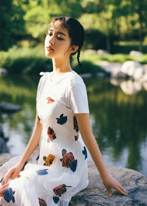 邓恩熙梳了两个短小的麻花辫,展示出几分娇俏的少女感,挺直了腰板,端坐在溪水边的岩石上,秀出纤长的天鹅颈,直直的,非常优雅有范儿。邓恩熙上身穿了件白色短袖T恤,带来清爽怡人的视觉感受。