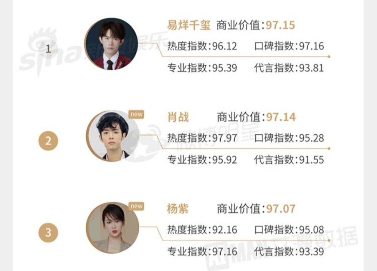 2019明星商业价值榜单出炉!杨紫第三,肖战第二,谁第一?