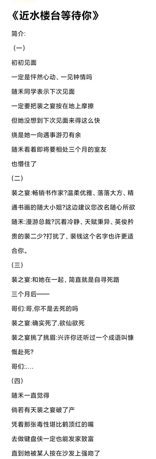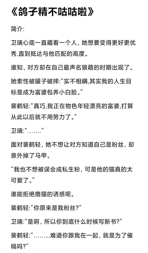 男主是IP杀手,写了很多小说,女主是个拖延症晚期的编剧,俗话就是鸽子精。是一个甜甜的恋爱故事