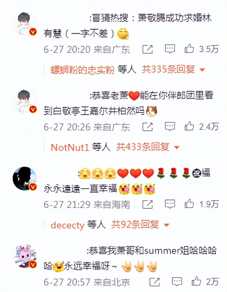 有的网友留言很有意思:“恭喜恭喜!要狠狠地幸福!” “记得全国高温地区都走一圈,不是让你去降雨,就是单纯地给全国人民分享下你们的快乐。”