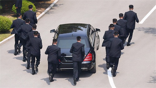 随后,保镖打开车门,保护着VIP雇主下车,两个保镖一前一后地把雇主围在中间,两个人保护一个人的是最简单的保护模式,遇到重要的雇主,就会增加到几十人。
