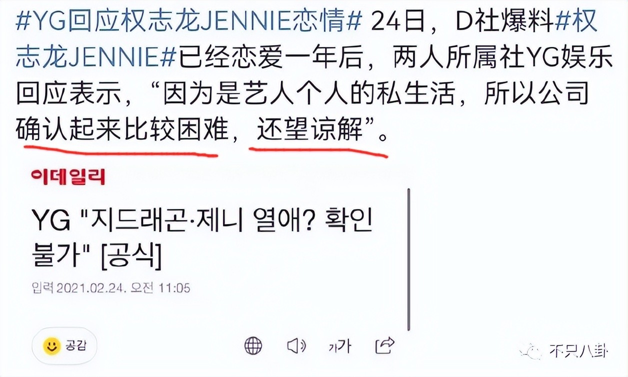 热知识,当初权志龙和BLACKPINK成员JENNIE爆出恋情的时候,YG也是说“艺人私生活,公司确认起来比较困难”。