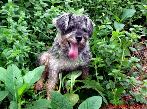 有时把卷毛独自放到草丛溜圈,自己外出买菜,等回来卷毛遛圈完毕会乖乖蹲在楼层底下等候主人,不会搭理陌生人。