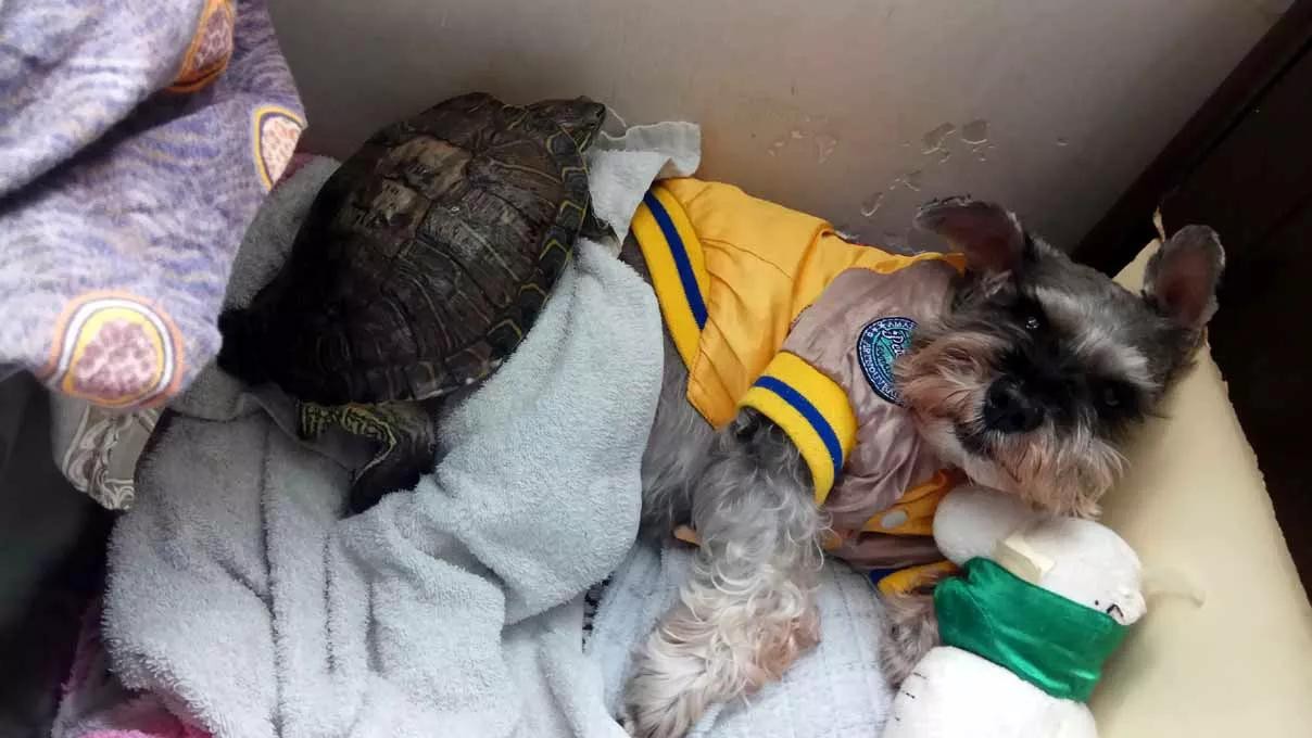 卷毛很友好,原来养的小猫咪找它玩耍打闹抓挠从不发脾气,冬天还与猫咪-老龟卧在床底相互取暖,俨然一幅高姿态。