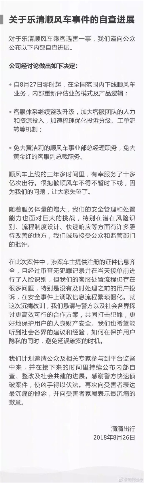 滴滴公司决定,自8月27日零时起,在全国范围内下线顺风车业务,内部重新评估业务模式及产品逻辑;免去黄洁莉的顺风车事业部总经理职务,免去黄金红的客服副总裁职务。