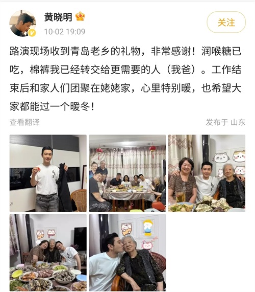之后,黄晓明回到了自己的青岛老家,和爸爸妈妈姥姥等人一起团聚过节,在晒照片的时候,还专门提到了自己收到青岛老乡送给自己的这条棉裤,还说把棉裤已经给到了自己的父亲,希望大家都能过一个暖冬。