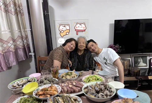 黄晓明回青岛老家聚餐,满桌海鲜显奢侈,小海绵照片打码引热议