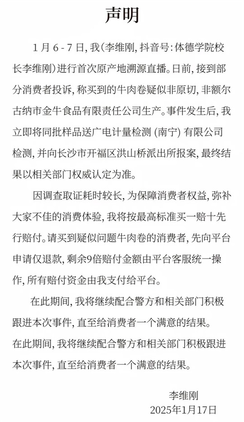 1月17日,李维刚发视频承认直播间所售“原切牛肉卷”实则为合成肉,产品确实存在“AB货”,并将按照“买一赔十”先行赔付。
