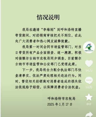 1月17日晚,呼和浩特市农牧局官方抖音账号发布情况说明称,该局在邀请“李维刚”到呼和浩特直播带货期间,对经销商审核把关不到位,在此向广大消费者和热心网友诚挚致歉。