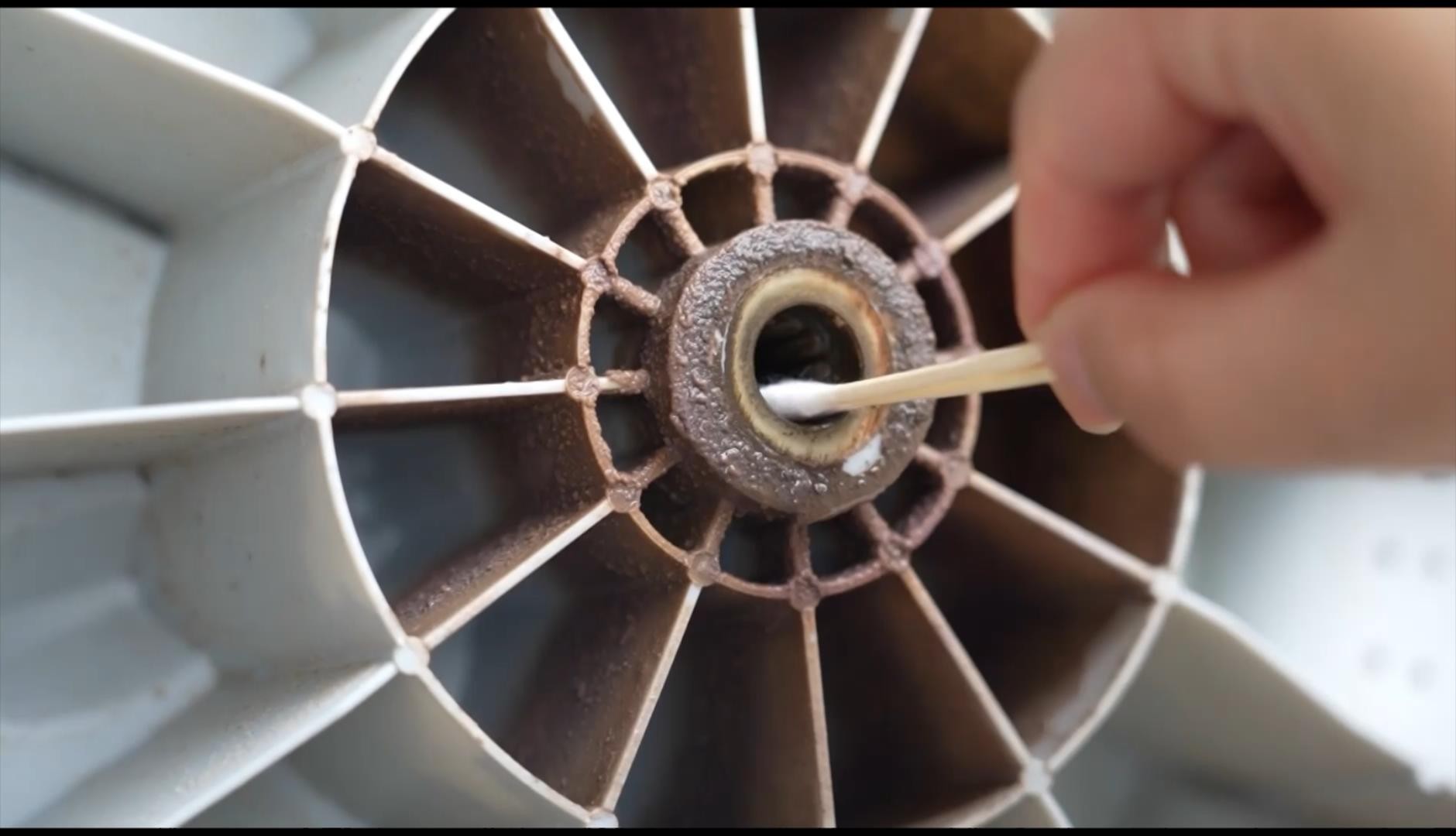 第三步:观观再次请杜师傅拆开洗衣机,在洗衣机内桶外壁,外筒内壁以及洗衣机底部齿轮槽里,依然有无法清洁的污垢,杜师傅告诉我们:“在洗衣机干净的情况下,清洁剂可以用作日常保养,如果洗衣机已经积累了多年的污垢,从未清洗过,清洁剂的去污力度无法达到宣传效果,附着在洗衣机夹层里的污渍依然会滋生细菌,一劳永逸的办法是每年进行一次拆机清洗,高温消毒去污。”