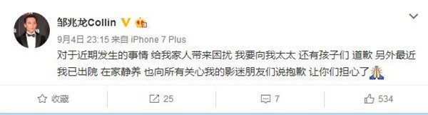 1905电影网讯9月4日晚,邹兆龙微博写道:“对于近期发生的事情,给我家人带来困扰,我要向我太太还有孩子们道歉。另外最近我已出院,在家静养,也向所有关心我的影迷朋友们说抱歉,让你们担心了。”疑似承认出轨。