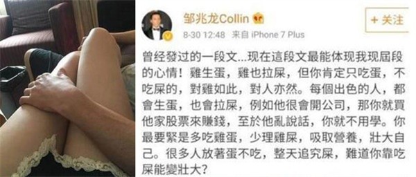 之前,有网友在微博上曝邹兆龙出轨,图片中邹兆龙把手放在女子腿上,两人举止十分亲密。随后邹兆龙微博发文怒怼爆料者,并以鸡屎比喻“出轨”事件。