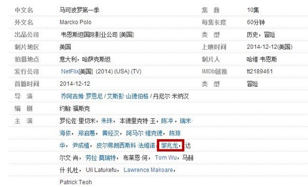 2014年《马可波罗第一季》还出现了中国演员邹兆龙。