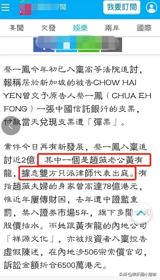 然而近日有香港媒体报道,赵薇老公黄有龙被名媛起诉讨要巨额债务,金额可能高达两个多亿。消息来源是在今年8月名媛蔡一凤曾在个人社交账号发文称:一名知名女星丈夫欠了她家巨额债款,至今还没有归还。