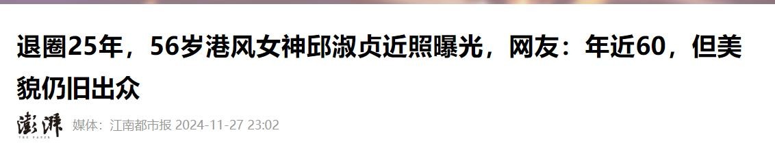 江南都市报在 2024-11-27关于《退圈25年,56岁港风女神邱淑贞近照曝光,网友:年近60,但美貌仍旧出众》的报道