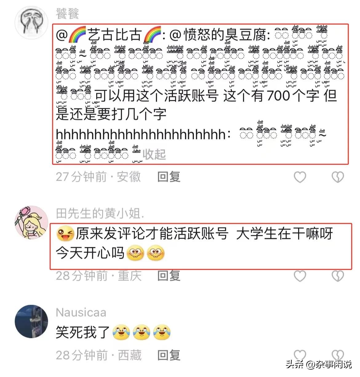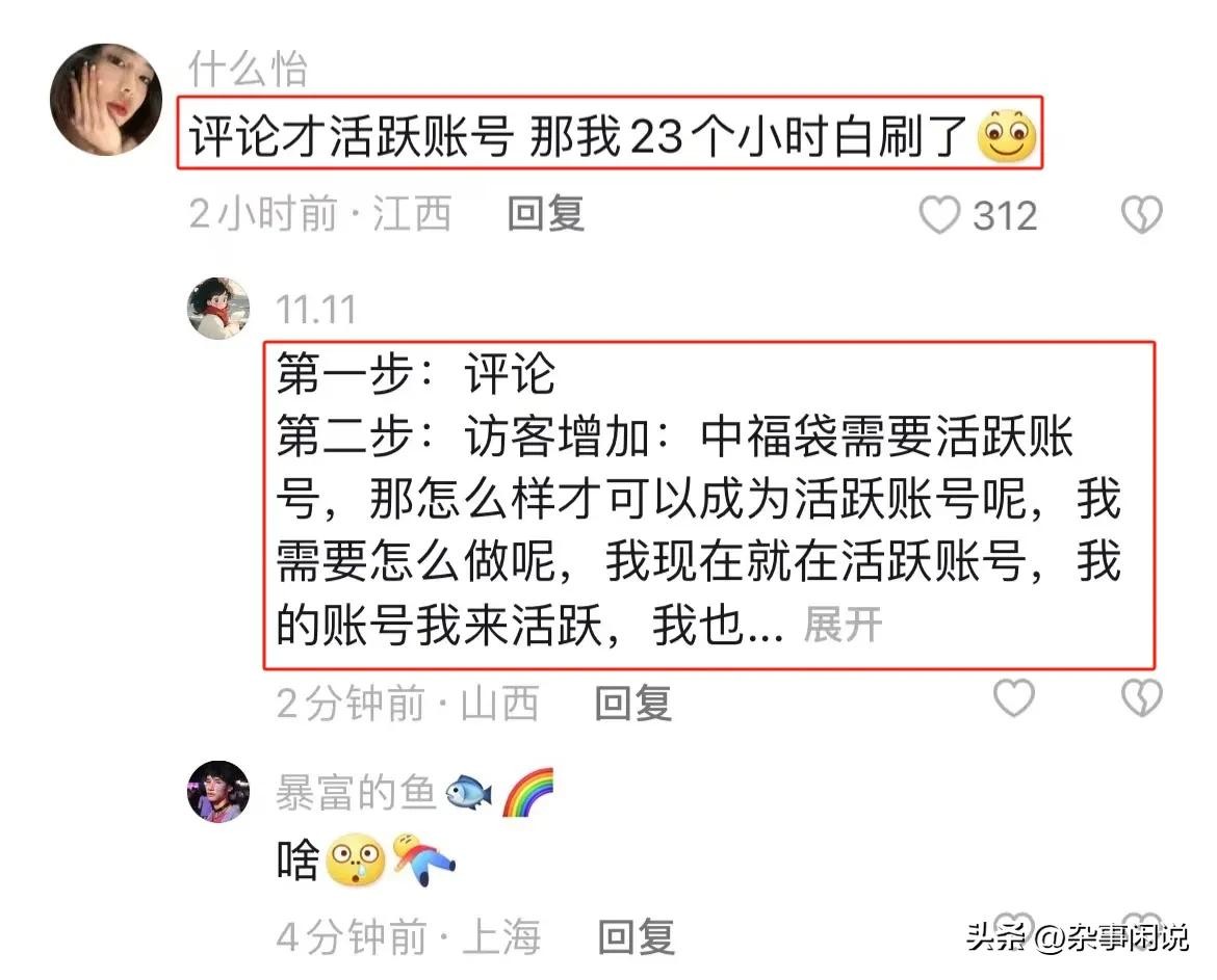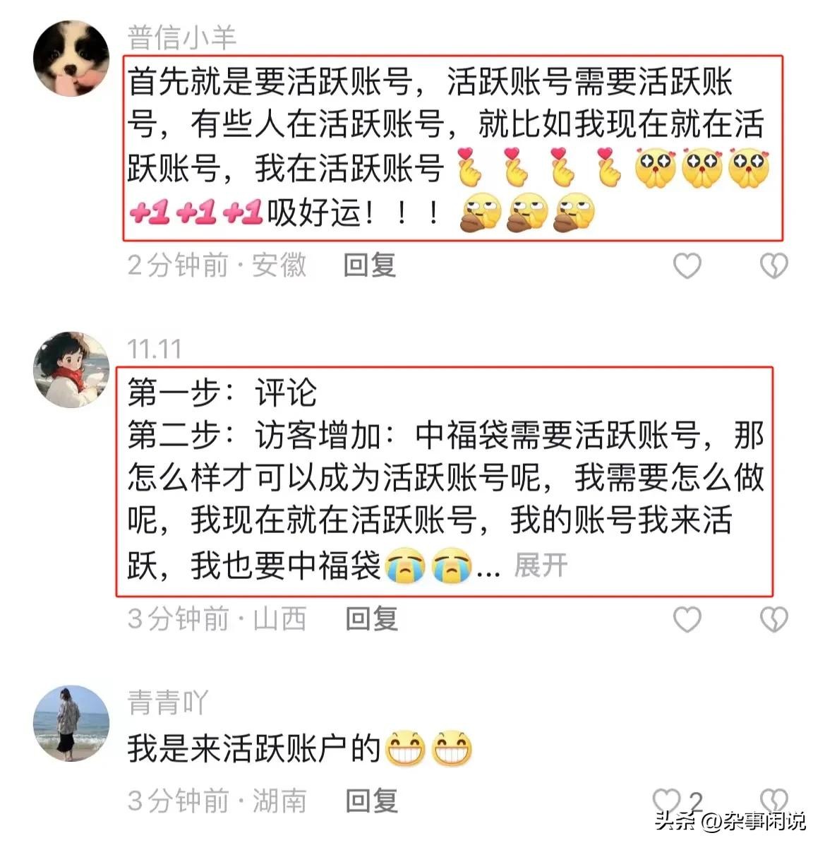 评论区是有自己思想的,自成一派,大家打招呼的方式默契的变为“你今天活跃账号了吗?”,大家才算是玩明白了评论区,纷纷分享活跃账号指南,账号活跃度直接影响中福袋的概率,看这节奏是00后接掌评论区了吗?