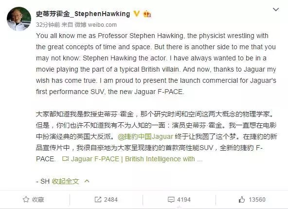 史蒂芬霍金微博发广告,网友:其他网红要丢饭碗了!