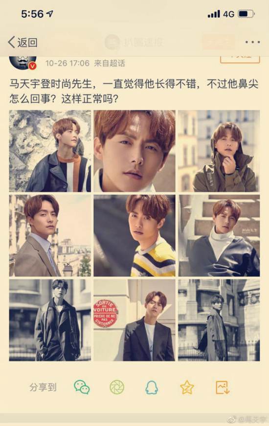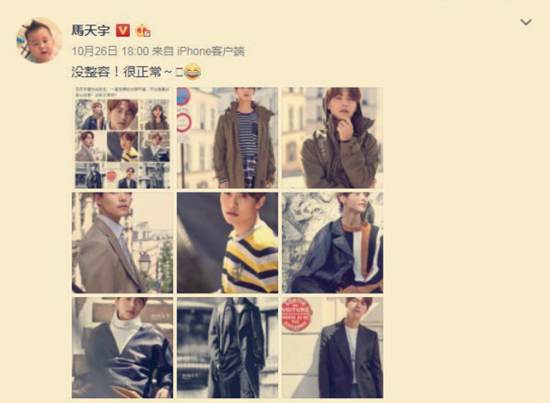 马天宇26日在微博发文回应没整容,很正常~并附上相同照片。网友戏称:真是耿直boy啊!