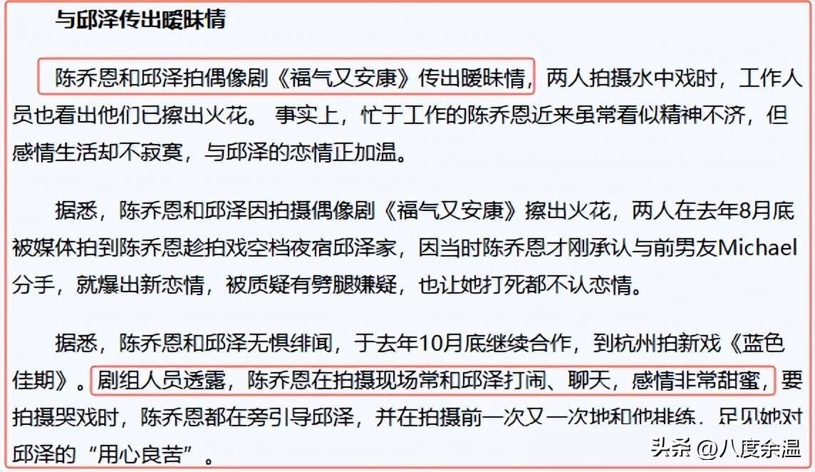 陈乔恩和邱泽合作拍摄偶像剧《福气又安康》时传出绯闻,有媒体捕捉到陈乔恩利用拍戏间隙,于夜间留宿在邱泽家中。