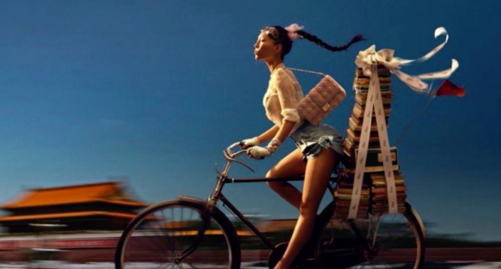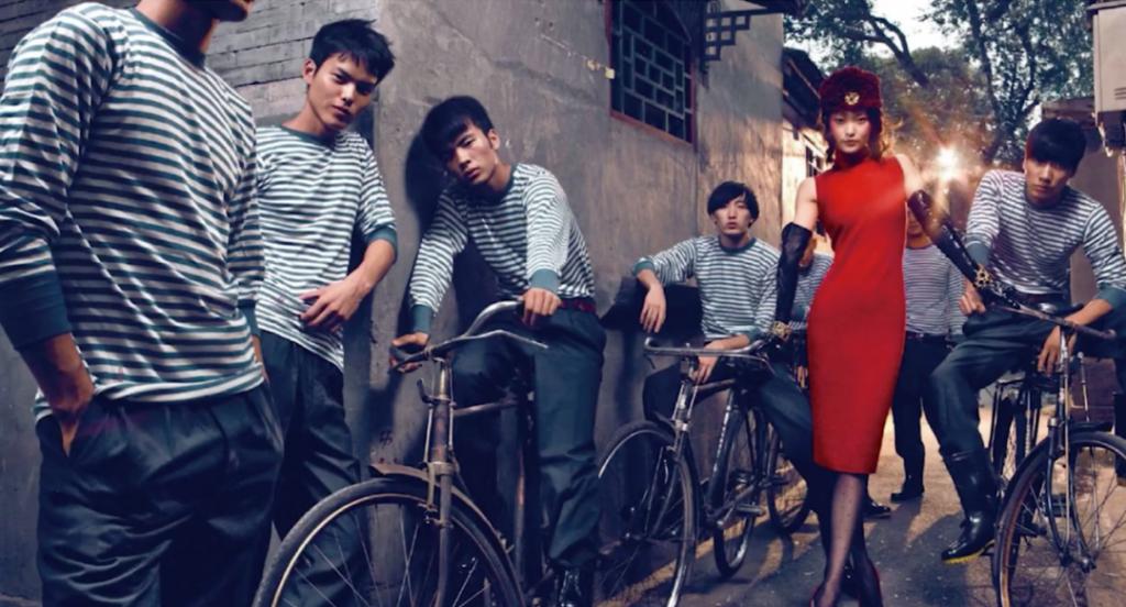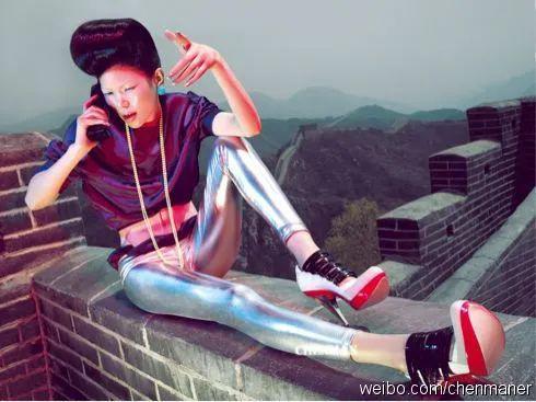 所以陈漫拍摄了很多带有浓浓中国元素的照片,比如杜鹃在国旗下敬礼,吕燕在长城上"谈生意",美艳大模在北京胡同里被小青年儿围观,冯宝宝骑自行车飞奔过长安街……