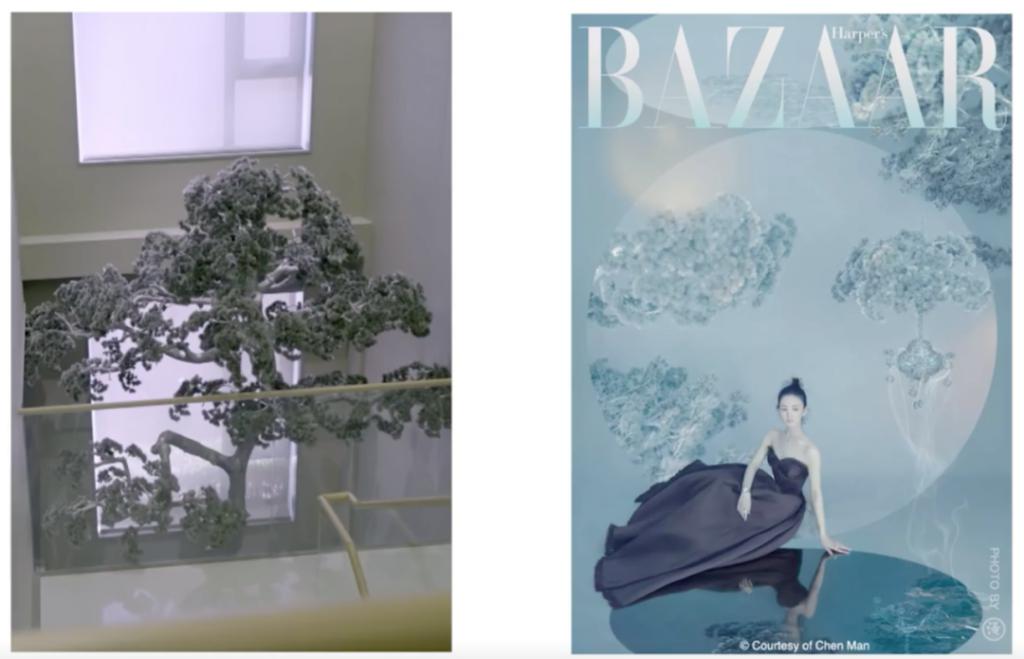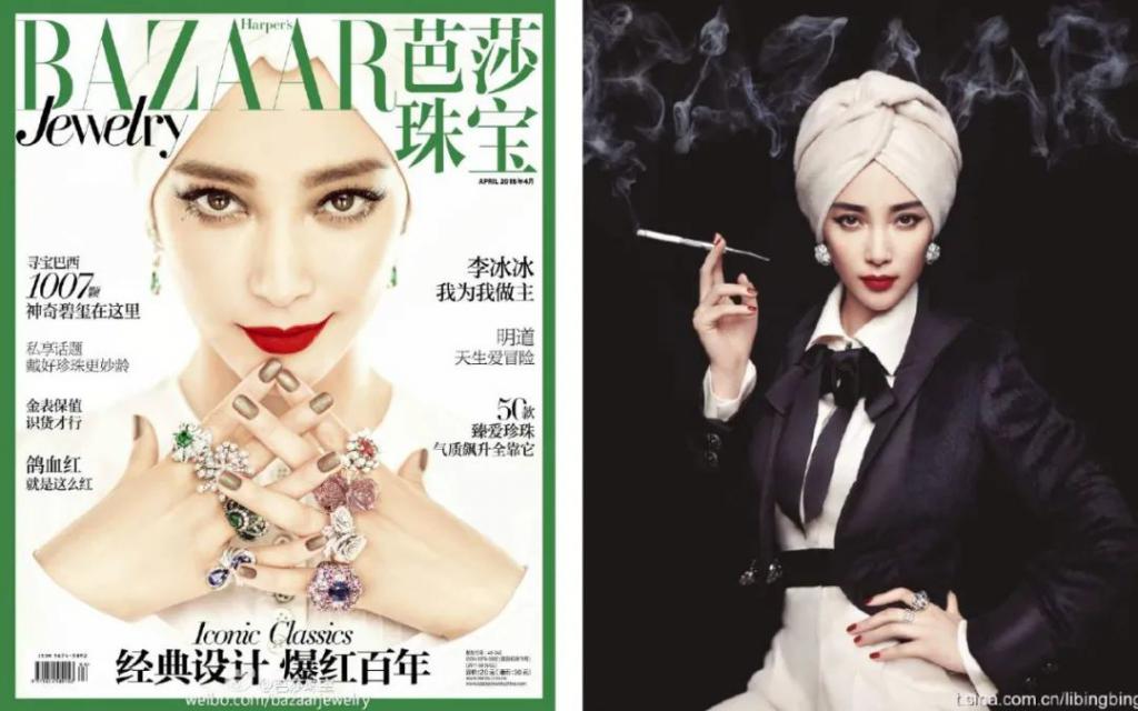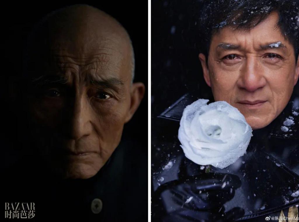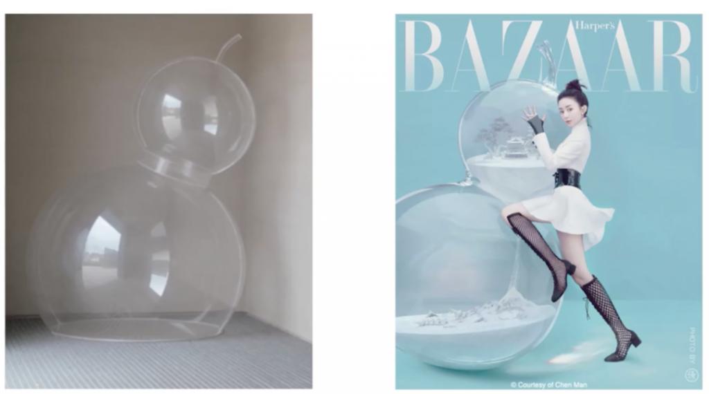 后来陈漫又走出了这份固执,直到现在,她还是频繁地使用道具、造型、化妆来给明星一个特定的氛围,也不排斥PS,前段时间周冬雨的光头就是找了个"头模"给P上去的,在此之前,范冰冰也用过这招。