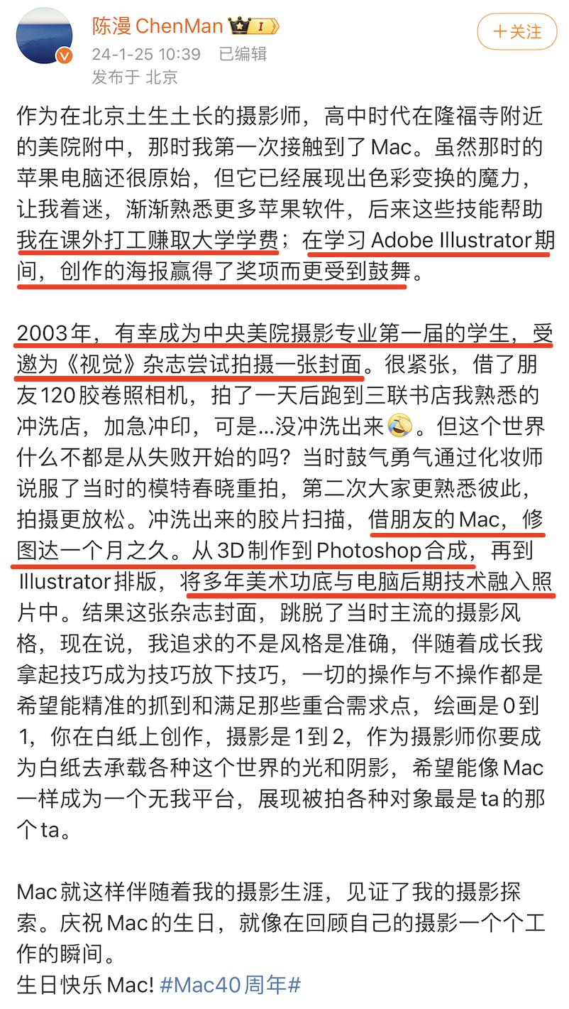 关于陈漫的真实水平和专业背景,业内有些摄影师不服气,我们不是内行,无从评判,但有一点是客观且真实的,那就是每个时代都有选中的人,而这个人并不一定是业务最强的,也并不一定是最聪明、最有才华的,但TA一定是综合素质最高的那个人,不要小看任何一个站在风口浪尖上的人物,大家怀里都揣着好几把刷子。