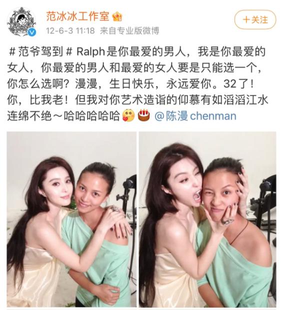 范冰冰一直高调地对陈漫宣示着友情,在微博里说"我是你最爱的女人"。